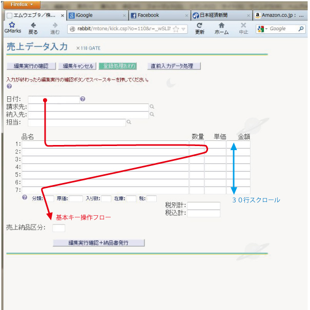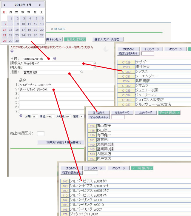 ブラウザによる売上データの複数一括入力画面(いちばん上の図)で、