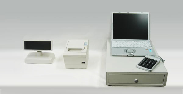 左から、カスタマディスプレイ、レシートプリンタ、レジ本体(ただのノートパソコンと外付けテンキー) 、キャッシュドロア。